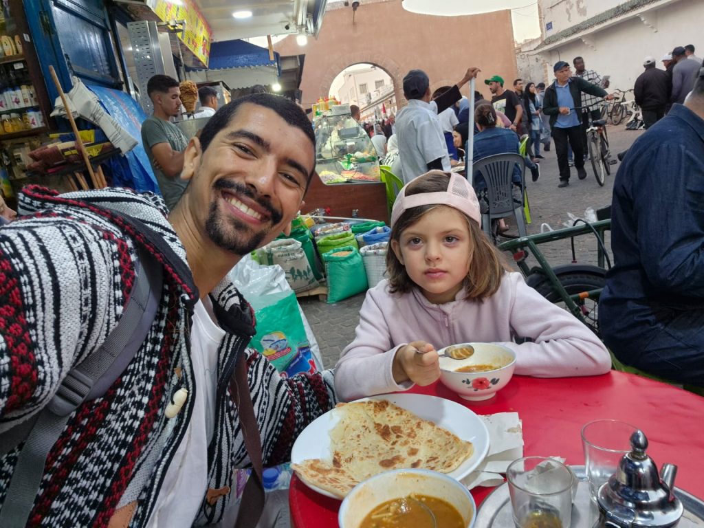 « Chacun trouve son bonheur à sa manière ; le mien, c’est d’aller au restaurant. De toute façon, quand on séjourne dans un riad, on n’a pas de cuisine pour être ZE chef cuisinier. Donc, pour la nourriture, il faut sortir… mais encore faut-il savoir où aller. Heureusement, grâce à Google et aux avis sur internet, il est très facile de dénicher de petites perles culinaires. Pour ma part, je choisis une valeur sûre : le Toubkal. Très bon marché, avec des produits de qualité, une cuisine propre… et une bonne réputation. Les tables se remplissent rapidement. Toutes les classes sociales viennent manger ici, mais le restaurant snack reste populaire. J’y vais pour le côté économique, mais surtout pour le côté populaire, car il est situé en plein cœur de la place Jemaa el-Fna. On pourrait dire que c’est la place la plus animée de Marrakech, et pour moi, c’est l’endroit idéal pour commencer mon séjour.
