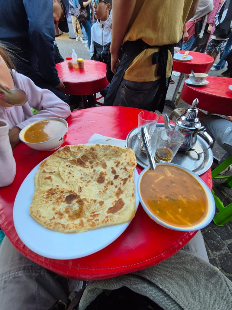 Dans la photo tu vois le msemen et la soupe traditionnelle Hrera. c’est le plat du pauvre. Je crois même qu’il est appelé comme ça, ce n’est pas qu’une expression. Et tu peux manger ça pour 6 dhiram la soupe et 3 a 4 dhiram le msemen. ce qui te donne environ 1€.